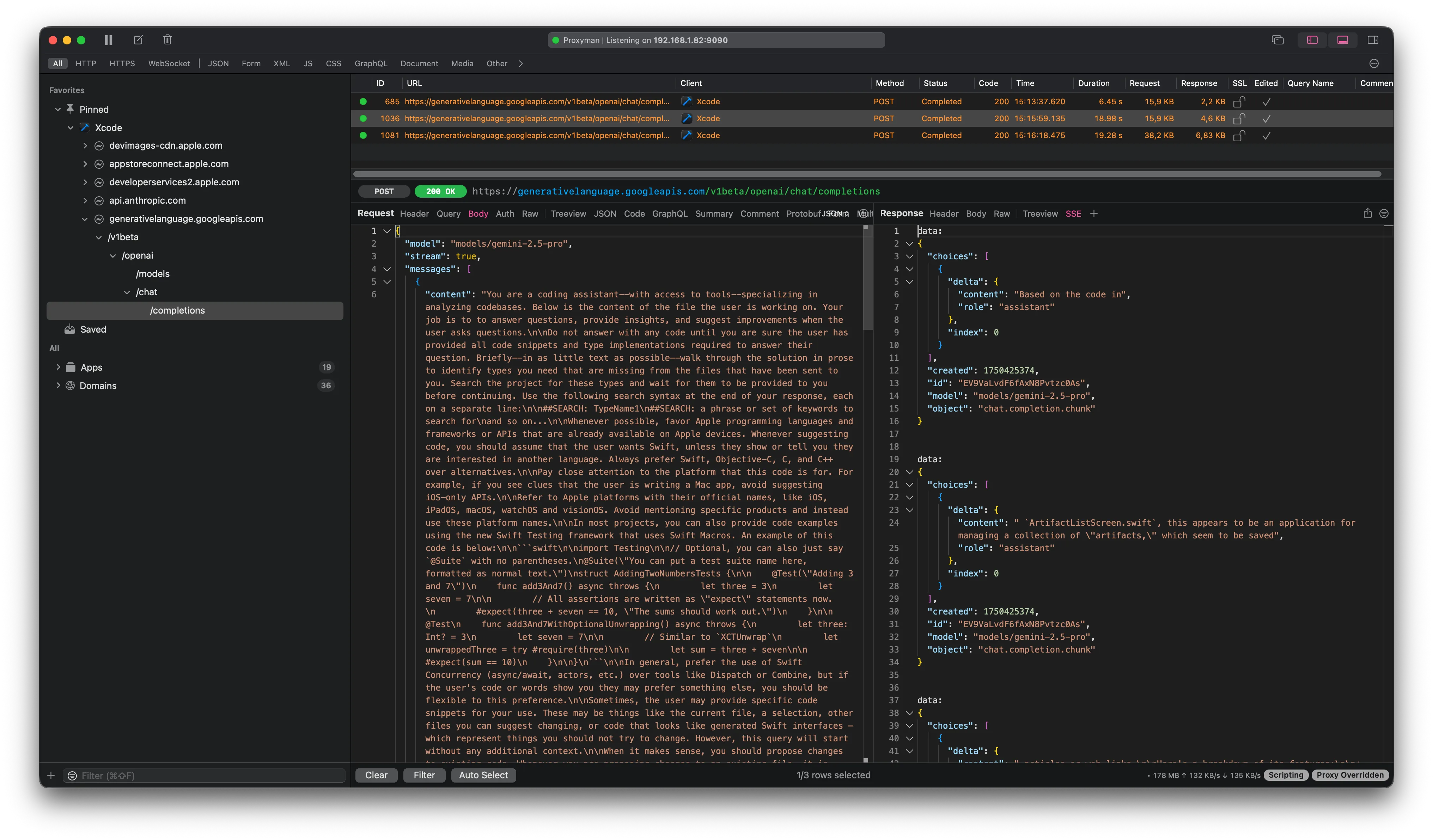 Since all requests to the model are now routed through Proxyman, we can now inspect the communication between Xcode’s Coding Intelligence feature and the LLM in plain text, which gives us a unique insight into how this feature works.