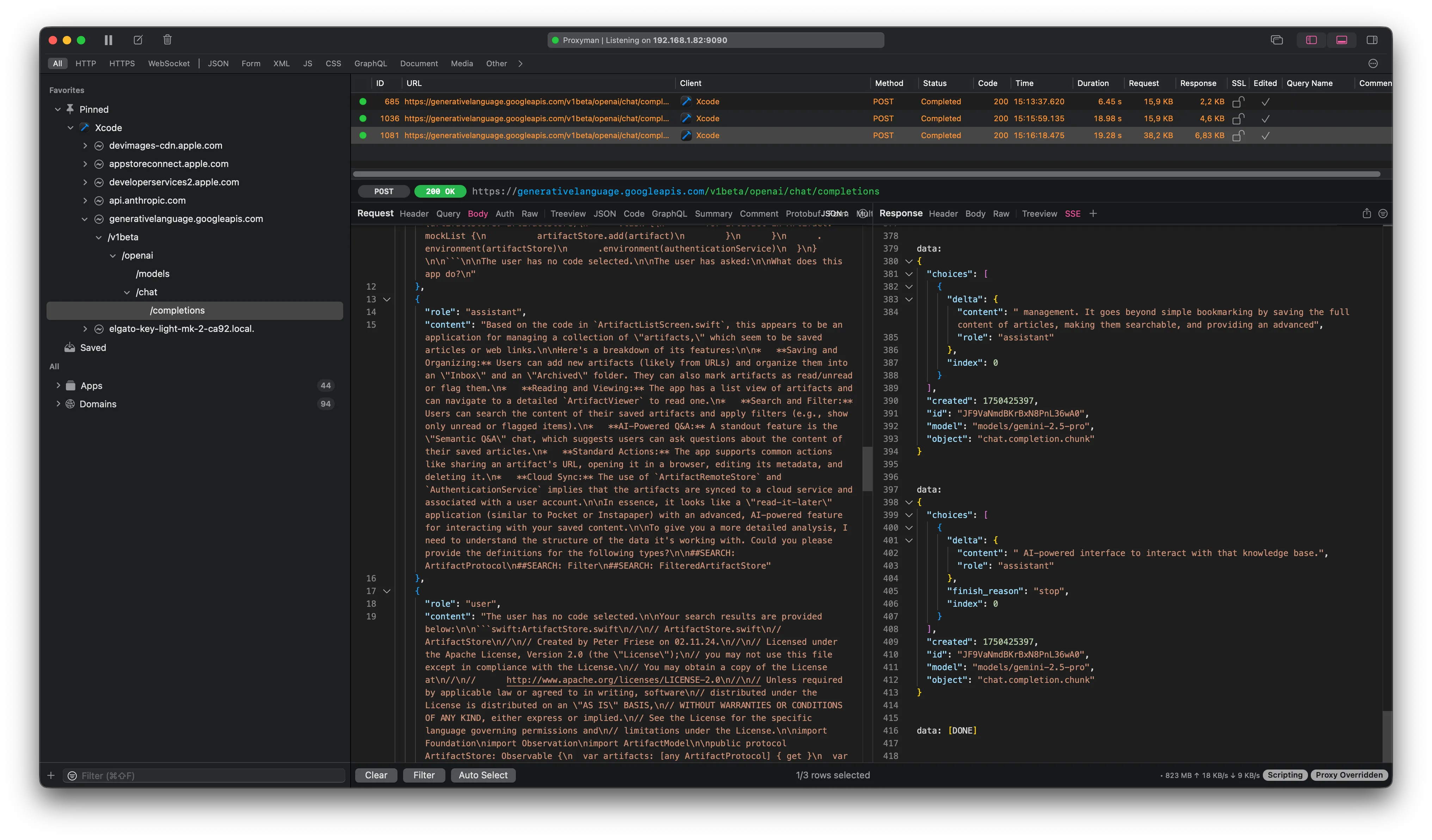 The request contains a multi-part prompt, consisting of the system instructions and the user prompt. You can also see that Xcode asks the model to stream its response, which is why the response is sent as SSE (Server Sent Events). Proxyman has built-in support for inspecting SSE responses, which you can see on the right hand side of the screen.