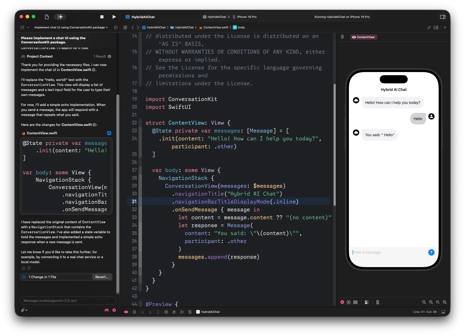 To set this up, I created a basic SwiftUI project, naming it HybridAIChat, and added ConversationKit as a dependency.